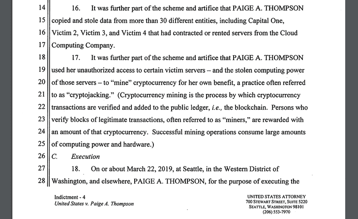 An indictment unsealed on Wednesday revealed that Thompson not just stole data from misconfigured servers hosted with a cloud-computing company, but also used the computing power of hacked servers to mine for cryptocurrency, a practice commonly known as "Cryptojacking."